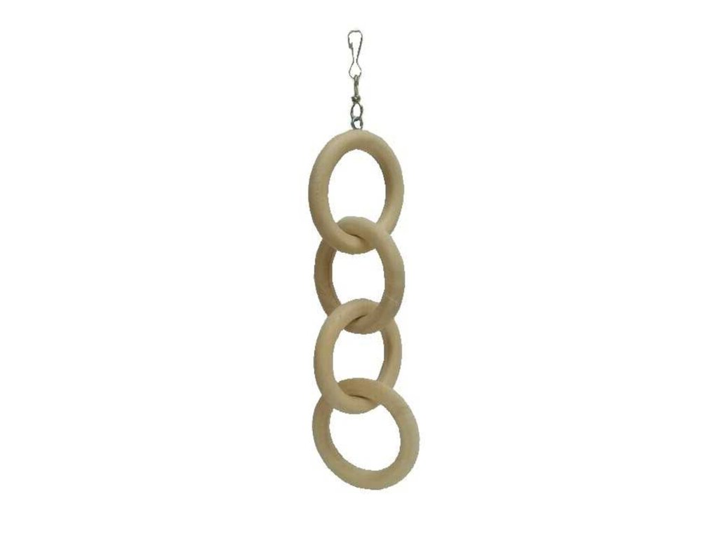 Láncba kapcsolt fa gyűrűk. A fa vastagsága kb. 1 cm, a külső átmérője kb. A forgónak köszönhetően a felcsavarozott szem akkor sem jön ki, ha a papagáj körben forog.