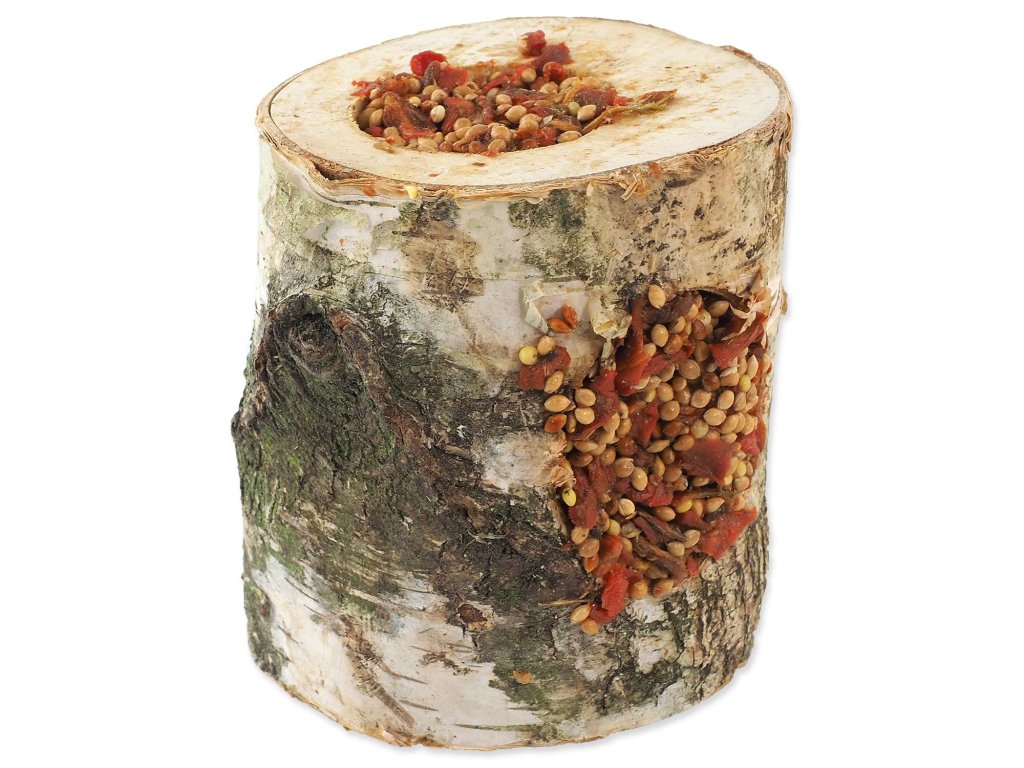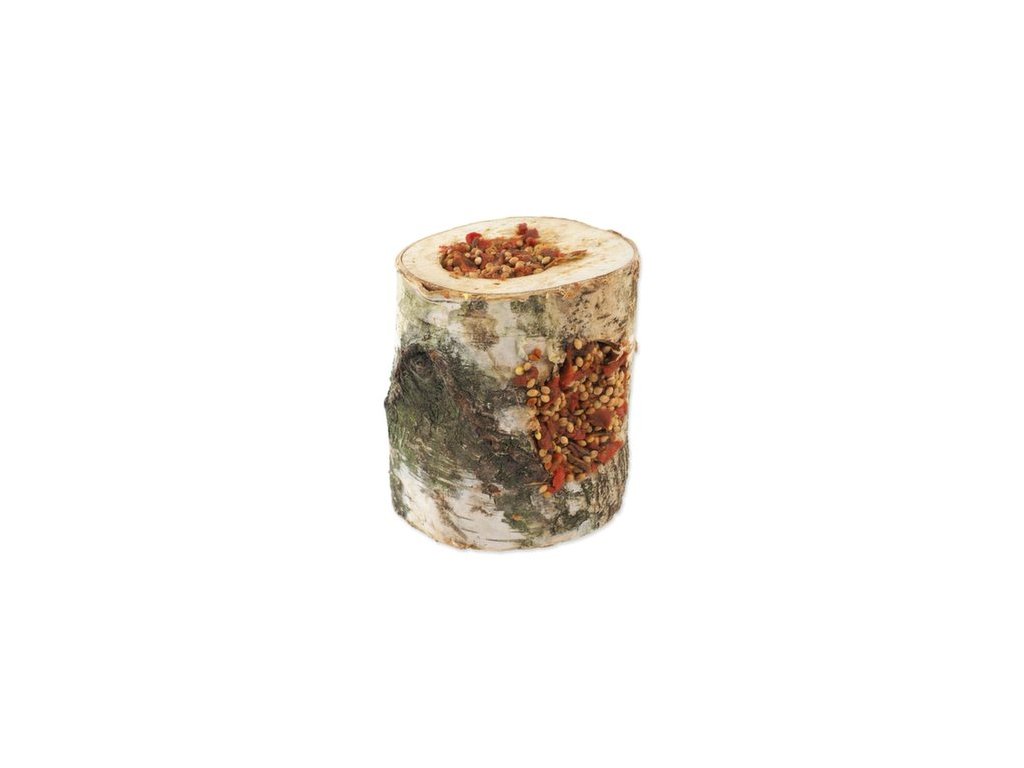 A lombhullató fából készült, ízletes sárgarépakeverékkel megtöltött henger egyszerre szolgál csemegeként és játékként is az állat számára. A fa harapása a természetes fogápolást is segíti.