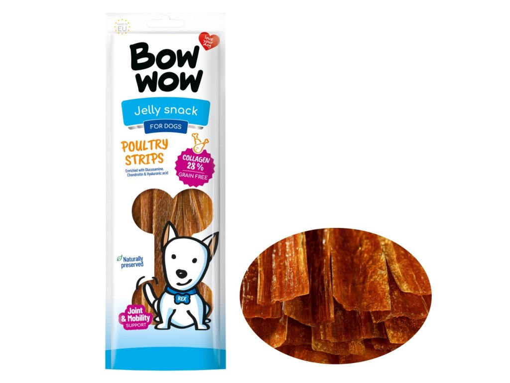 Pochoutka pro psy ve tvaru drůbežích stripsů pro silné klouby.