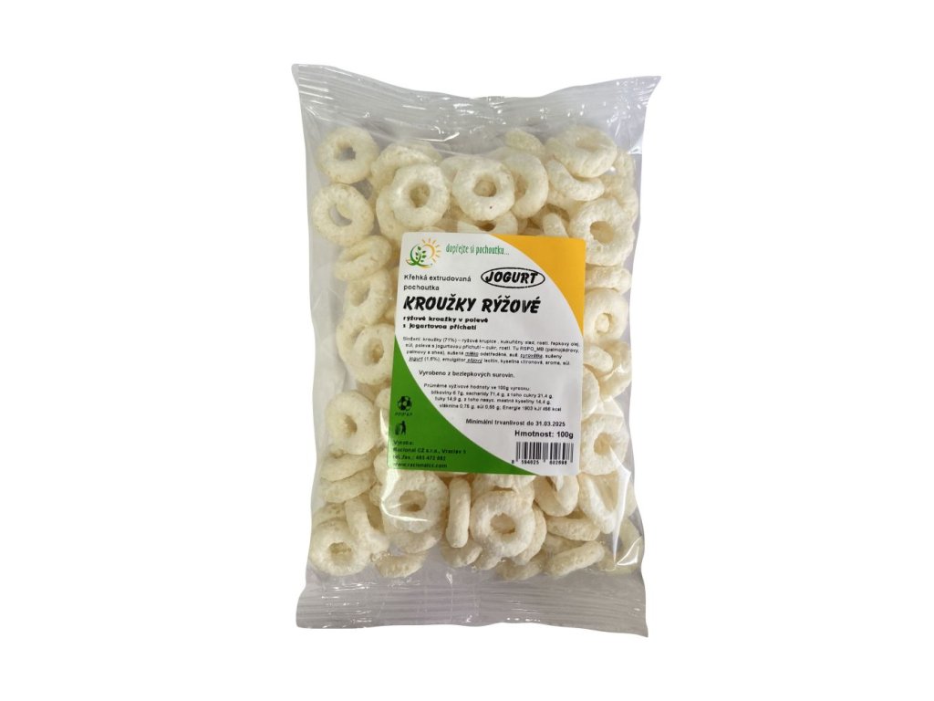 Křehká extrudovaná pochoutka. Kroužky rýžové v polevě s jogurtovou příchutí. Vyrobeno z bezlepkových surovin.Složení: