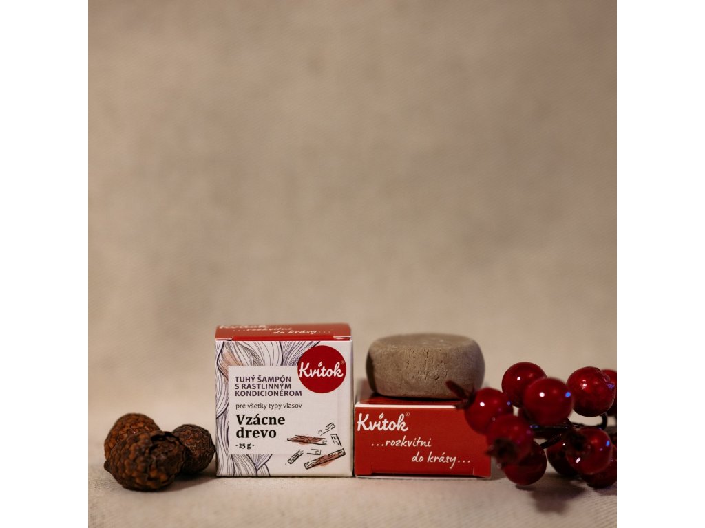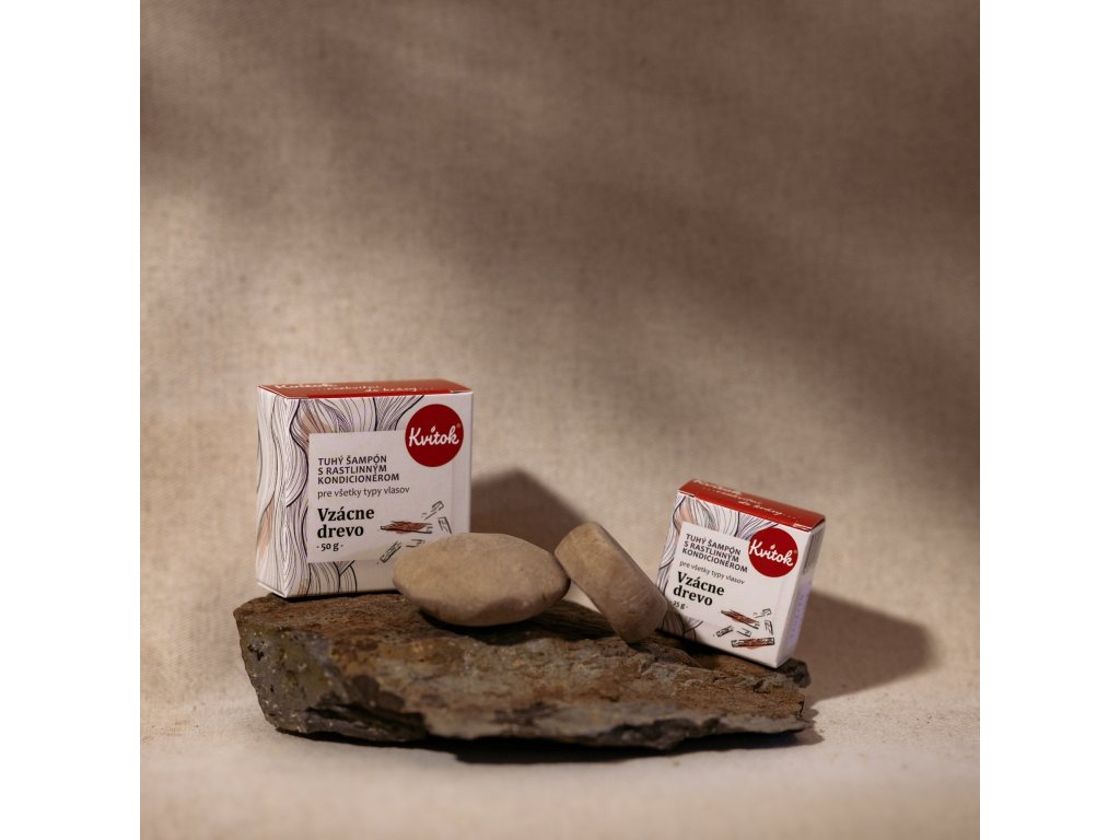 Kvitok Tuhý šampon s kondicionérem pro tmavé vlasy Vzácné dřevo 25 g - krásně pění