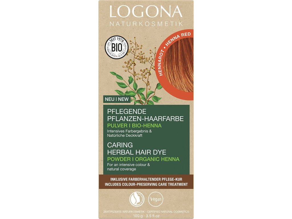 LOGONA VÝŽIVNÁ ROSTLINNÁ BARVA NA VLASY dodává vlasům intenzivní barevný výsledek s přirozeným krytím a zdravým leskem. Vysoce kvalitní, veganská receptura prášku se skládá z organické henny a dalších, čistě přírodních barviv rostlinných látek.
