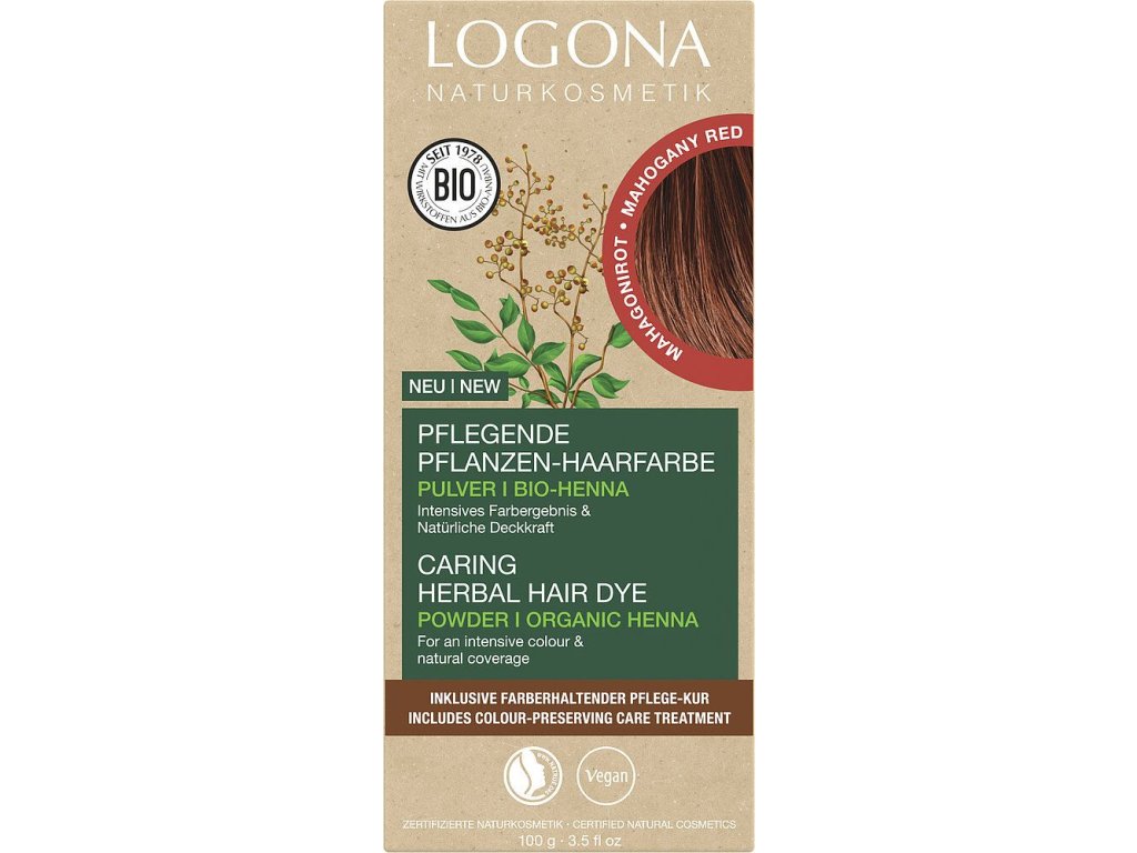 LOGONA VÝŽIVNÁ ROSTLINNÁ BARVA NA VLASY dodává vlasům intenzivní barevný výsledek s přirozeným krytím a zdravým leskem. Vysoce kvalitní, veganská receptura prášku se skládá z organické henny a dalších, čistě přírodních barviv rostlinných látek.