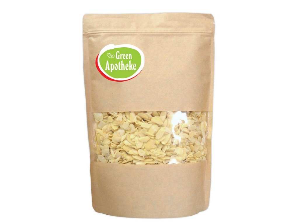 Blanšírovaná a krájená jádra sladkých mandlí.