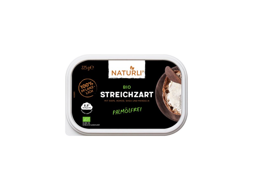 Naturli' BIO veganský roztíratelný tuk je alternativou másla. Pomazánka Naturli' se vyrábí z řepky, kokosu, bambuckého oleje a mandlí a neobsahuje palmový olej.