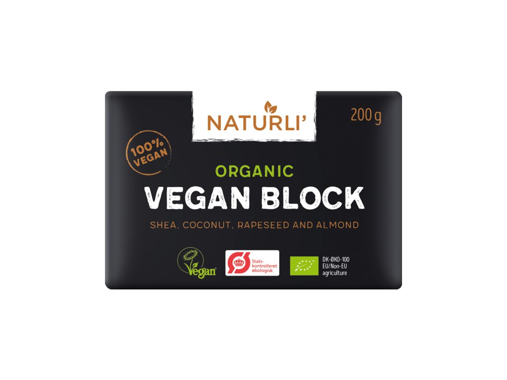 Roztíratelný blok Naturli' BIO je rostlinnou alternativou másla. Naturli' Block se vyrábí z bambuckého, kokosového, řepkového a mandlového oleje a neobsahuje palmový olej.
