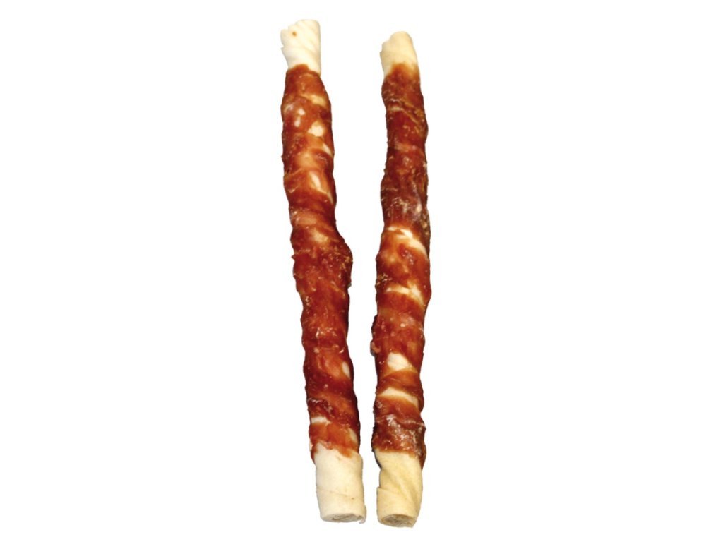 Tento pamlsek je vyroben z kvalitních přísad, bez umělých barviv nebo dochucovadel a obsahuje 2% tuku! Váš pes touto formou hry uspokojí své kousací vášně a zároveň posiluje čelistní svalstvo. Pamlsky pomáhají pečovat o zuby psů tím, že dochází k drhnutí povrchu zubů. Intenzivní kousání a žvýkání také uspokojuje přirozenou potřebu psů něco kousat a pomáhá udržovat svěží dech. Pochoutka z buvolí kůže a zapečeného kachního masa. Přírodní zubní péče pro psy napomáhá odstraňování zubního povlaku psů. Nízkokalorický pamlsek Dodáváno v uzavíratelném sáčku. Velikost cca. 25 cm, ø 20 mm V balení 4ks tyčinek Příbalový leták: Doplňkové krmivo pro psy Složení: 54,3% hovězí kůže, kuřecí maso 47,7% Analytické složky: protein 88,0%, obsah tuku 2,0%, vláknina: 1,0%, popel: 2,5%, vlhkost: 18,0% Krmivo podávejte jako odměnu nebo kdykoliv jako součást vyvážené stravy. Uchovávejte v suchu a chladu. Vždy zajistěte dostatek čerstvé vody. Není určeno pro lidskou spotřebu.Doplňkové parametry