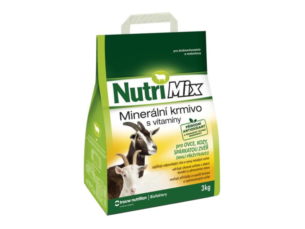 ŘEŠENÍ: NutriMix pro kozy je určen na doplnění minerálních látek a potřebných vitaminů do krmných dávek zvířat chovaných v drobnochovech. Přispívá k udržení dobrého zdravotního stavu a životaschopnosti mláďat. Je určen ke každodennímu doplňování méně hodnotných krmiv.