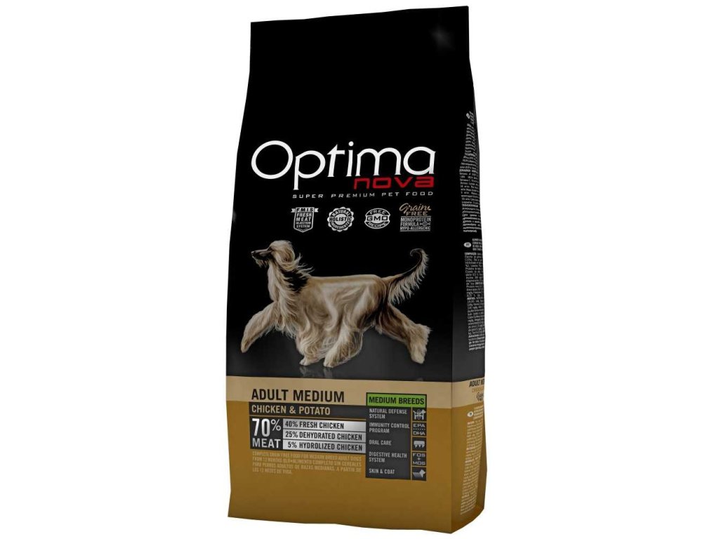 OPTIMAnova Dog Adult Medium Chicken & Potato GF složené z kvalitních bílkovin a lehce stravitelných sacharidů v kombinaci s prospěšnými tuky. Krmivo obohacené o vitamíny, minerální látky a antioxidanty.