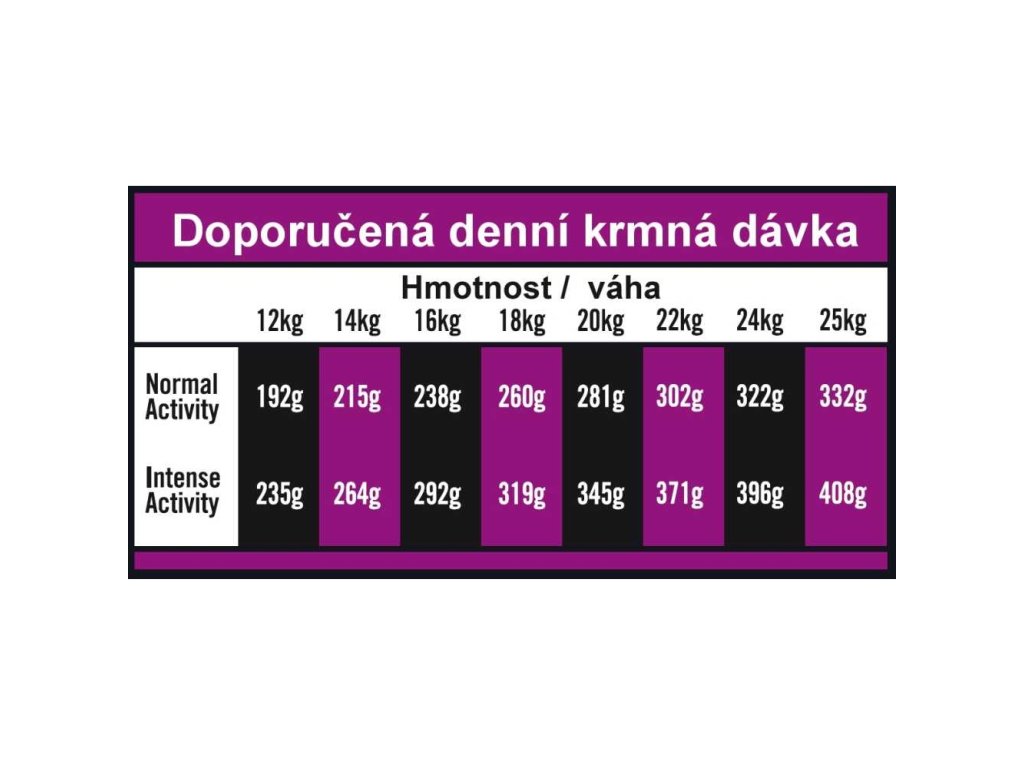 Analytické složky: Hrubý protein 26 %, hrubý olej a tuky 16 %, EPA+DHA 770 mg / kg, hrubá vláknina 2,5 %, hrubý popel 8 %, vápník 1,35 %, fosfor 0,95 %.