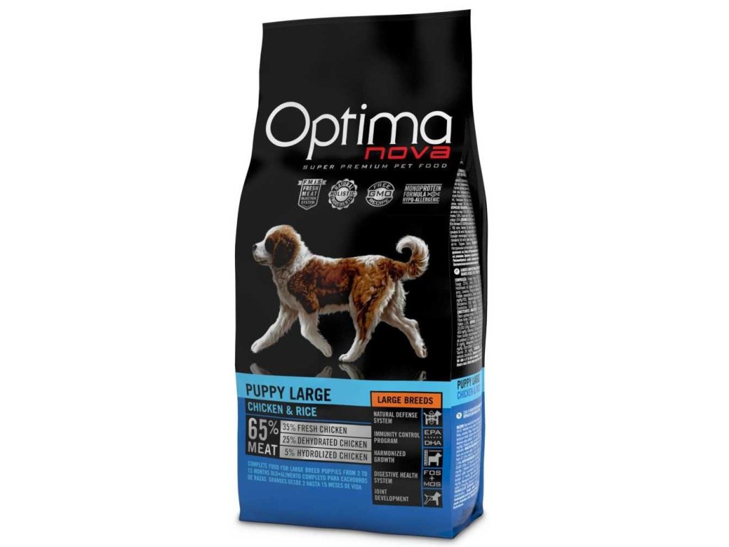 OPTIMAnova Dog Puppy Large Chicken & Rice složené z kvalitních bílkovin a lehce stravitelných sacharidů v kombinaci s prospěšnými tuky. Krmivo obohacené o vitamíny, minerální látky a antioxidanty.