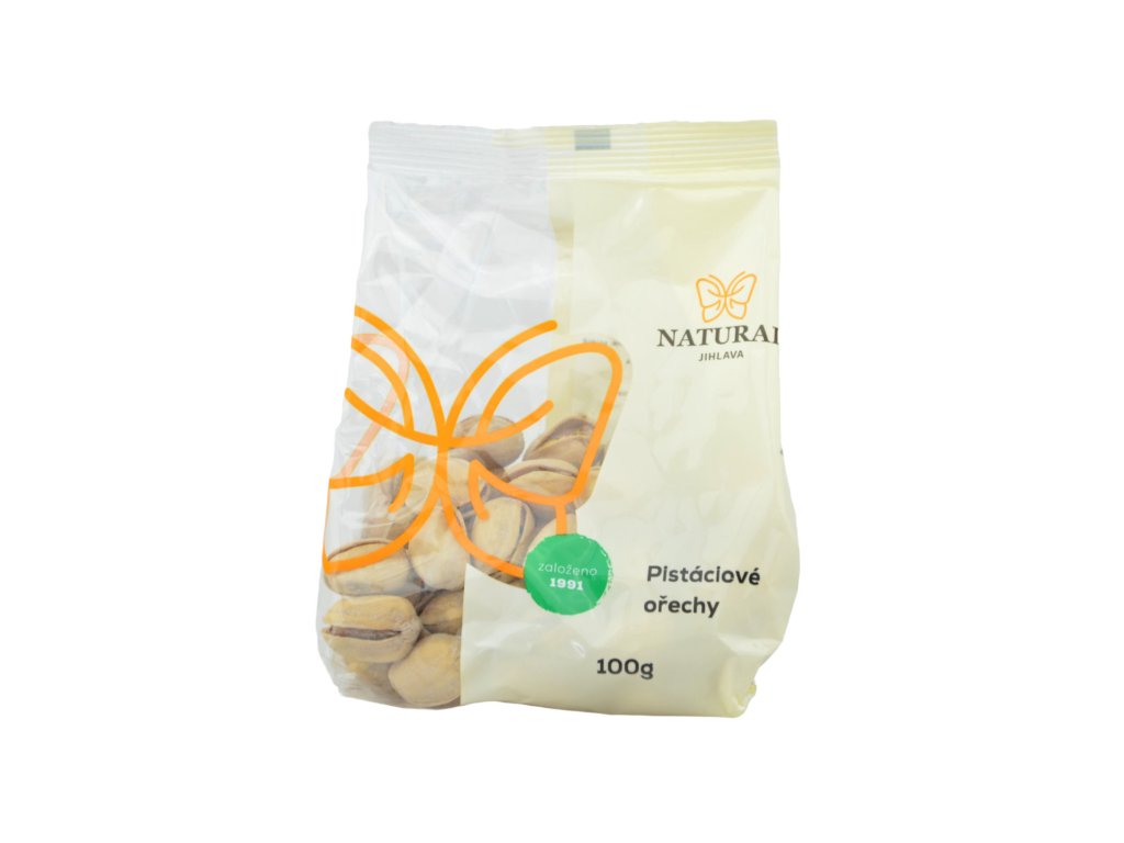 Složení: PISTÁCIE mírně solené Pistácie jsou výborným zdrojem tuků, kterých obsahuje zhruba 48 %, bílkovin 20 %, sacharidů 27 % a vlákniny zhruba 10 %. Dále obsahují vitamín B komplex, A, E, vápník, fosfor, draslík, měď a železo. Pistácie obsahují i fytosteroly a karotenoidy. Přispívají ke snížení špatného cholesterolu a vysokého tlaku, a naopak posilují dobrý cholesterol.Nutriční hodnoty