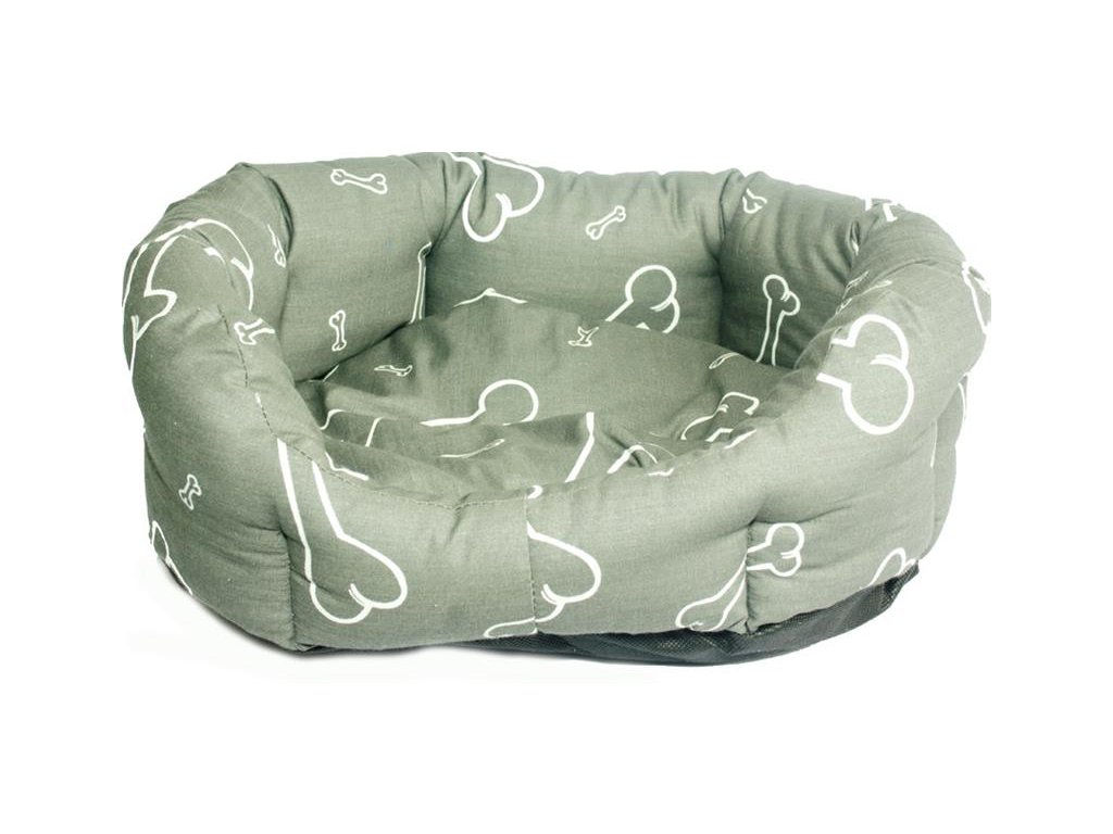 Pohodlný, kvalitní pelech vyrobený z bavlněné látky potištěné kostmi a kostičkami, vyplněný dutým vláknem. Pelíšek je v několika bodech prošitý, aby nedošlo k nerovnoměrnému rozmístění výplně. Polštářek je vyjímatelný. Boky pelíšku jsou kvůli dobré opoře bohatě vyplněny. Pelech se lehce udržuje.