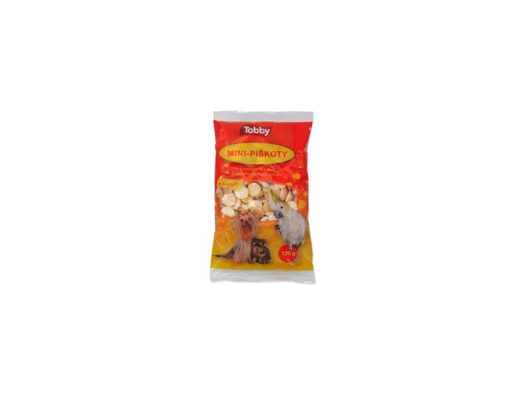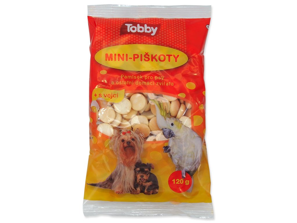 Tobby piškoty jsou určeny pro psy a i pro ostatní domácí zvířata pouze jako pamlsek nebo odměna. Tento druh pamlsku utužuje přátelský kontakt se zvířetem. Snížený obsah cukru v krmivu napomáhá zdravému životu zvířete a může příznivě napomáhat k dobré stravitelnosti a ke zvýšení chuti k jídlu. Zvýšený obsah vápníku napomáhá zvýšit tvrdost a pevnost kostí a zubů. Množství pamlsku nesmí přesáhnout 1/4 běžné krmné denní dávky.