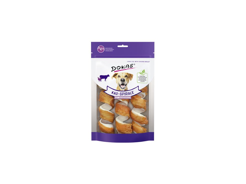 Spiralne kości do żucia ze skóry wołowej zawinięte w mięso z piersi kurczaka sprawiają, że są jeszcze smaczniejsze. Żucie pomaga zachować zdrowe zęby i dziąsła. Wysoka jakość użytych składników gwarantuje wyjątkowy smak i aromat. Są bardzo popularne ze względu na swój naturalny skład. Przysmaki Dokas nie zawierają konserwantów, sztucznych barwników, aromatów ani gliceryny. Torebka posiada praktyczne zamknięcie, dzięki któremu przysmaki pozostają świeże i pachnące na dłużej. Składniki: skóra wołowa 80%, filet z piersi kurczaka 16%, produkty uboczne pochodzenia roślinnego, minerały. Analiza: białko surowe 90,9%, oleje i tłuszcze surowe 3,3%, popiół surowy 2,7%, włókno surowe 0,5%, wilgotność 11%. Opakowanie 3 szt. po 110 g. Służyć jako nagroda. Zapewnij odpowiednią ilość wody pitnej. Po otwarciu dokładnie zamknij zamek błyskawiczny i przechowuj w suchym i chłodnym miejscu. Opakowanie zawiera pochłaniacz tlenu pozwalający zachować jakość produktu. Przysmaki stanowią dziś nieodłączny element żywienia zwierząt domowych, dlatego należy zwracać uwagę nie tylko na ich smak, ale i na to, czy są zdrowe. Kupując produkty Dokas, możesz mieć pewność, że wszystkie użyte surowce spełniają surowe kryteria i są regularnie kontrolowane w trakcie produkcji. Przysmaki dla psów i kotów Dokas podlegają regularnym kontrolom jakości przeprowadzanym przez światowej sławy niemiecki instytut SGS Institut Fresenius. To niezależne laboratorium należy do wiodących europejskich firm zajmujących się testowaniem jakości żywności.Parametry dodatkowe