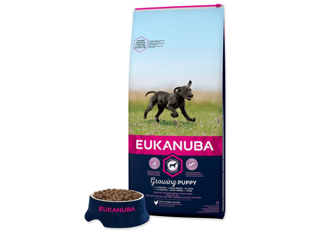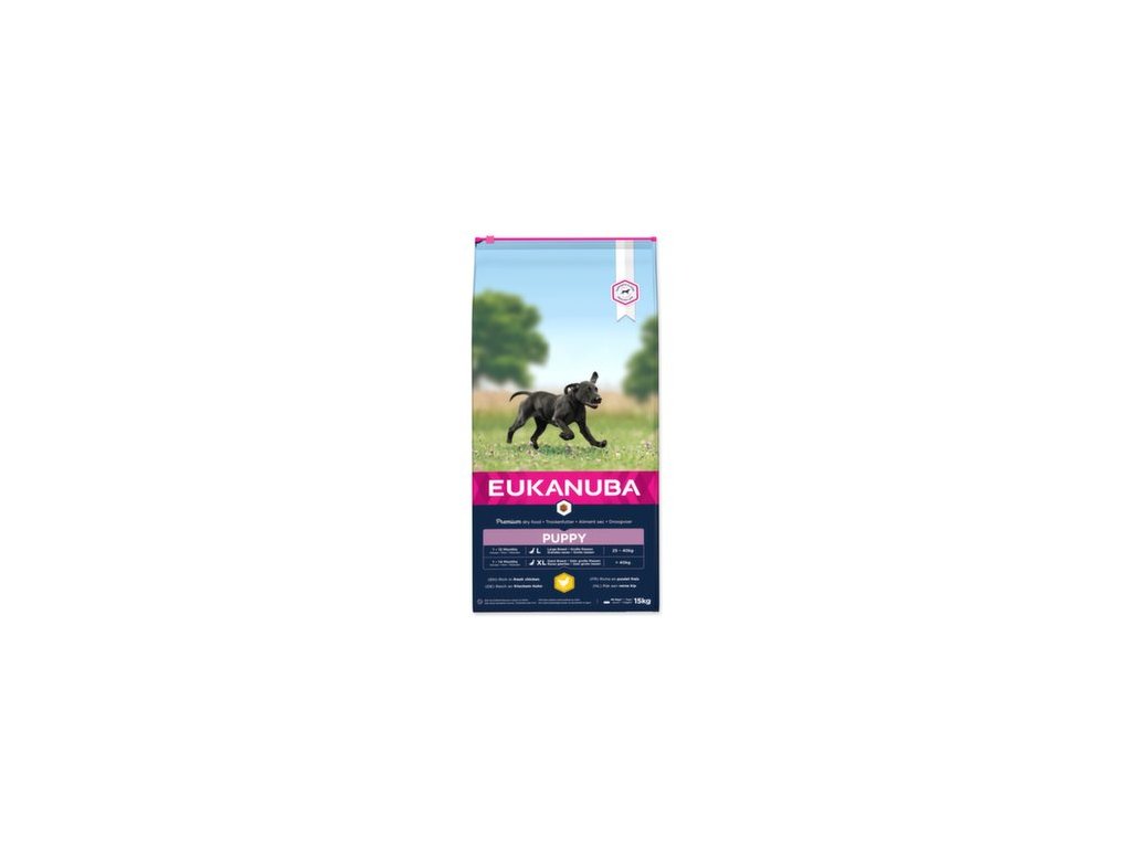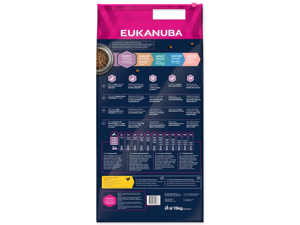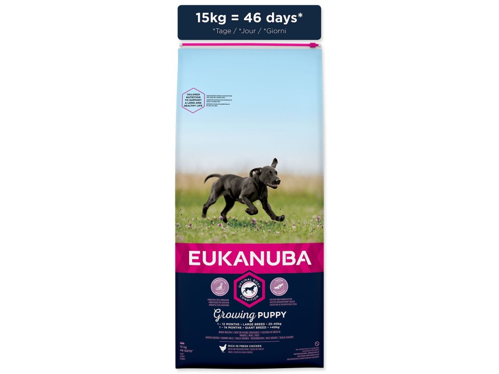 Nowa ulepszona formuła EUKANUBA, skupiona na konkretnym etapie życia - dla szczeniąt dużych ras w wieku od 3 do 14 miesięcy– zapewnia w 100% kompletne, dostosowane i zbilansowane odżywianie, które wspomaga wzrost i rozwój Twojego szczeniaka. Nasza wyjątkowa, specjalnie opracowana formuła dla szczeniąt dużych ras zawiera DHA, który pomaga szczeniętom uczyć się szybciej i łatwiej szkolić, mieszankę błonnika, prebiotycznych FOS i miąższu buraczanego, które wspomagają zdrowe trawienie, wapń dla zdrowego wzrostu kości, naturalne źródło kwasów tłuszczowych omega-6 i omega-3 dla zdrowej skóry i sierści, a także antyoksydacyjne witaminy E i C, które wspomagają układ odpornościowy. Nasze wyjątkowe granulki w kształcie sześciokątów z dodatkiem DentaDefense pomagają również utrzymać czyste i zdrowe zęby. Zaawansowane odżywianie dla szczeniąt dużych ras, mające na celu wspieranie optymalnej kondycji ciała i dobrego samopoczucia przez całe życie.