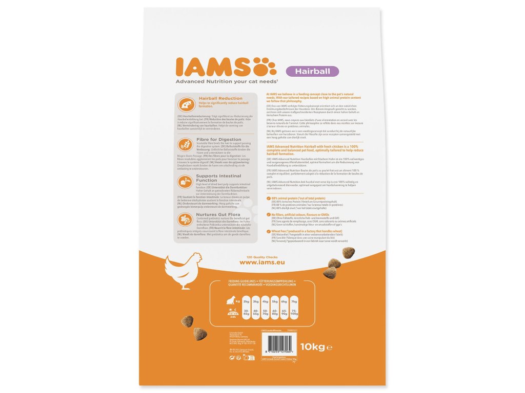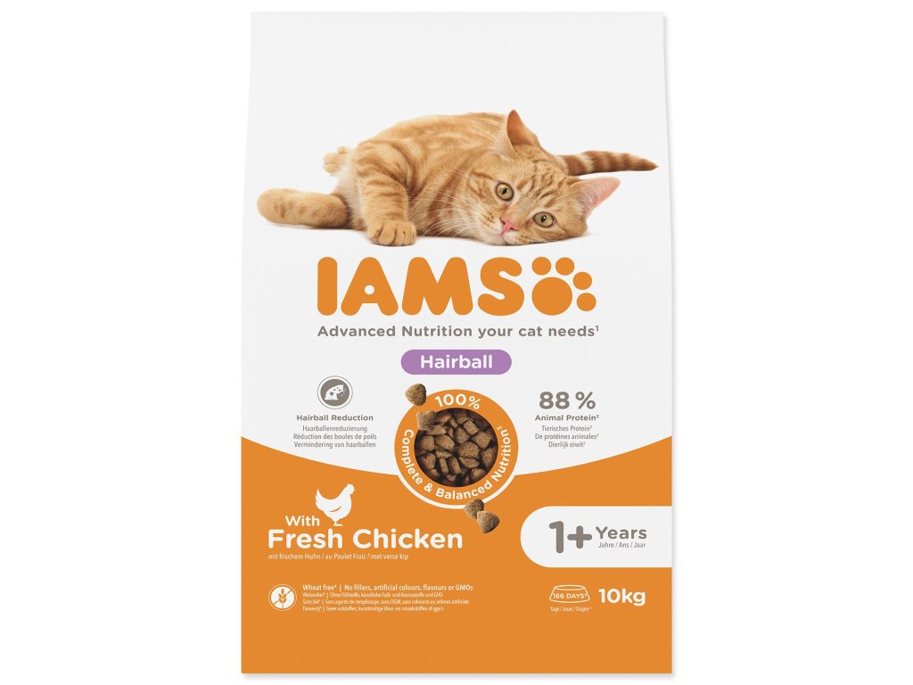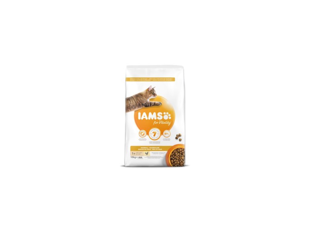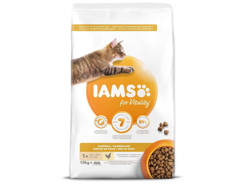 IAMS for Vitality karma redukująca powstawanie kul włosowych dla dorosłych i starszych kotów to w 100% kompletna i zbilansowana, opracowana przez ekspertów karma, która przypadnie do gustu Twojemu pupilowi i przyniesie mu korzyści. Nasza nowa, ulepszona receptura ze świeżym kurczakiem opiera się na wysokiej jakości białkach zwierzęcych, starannie dobranych tak, aby wspierać siedem oznak zdrowej witalności u dorosłych i starszych kotów. Aby koty były zdrowe, aktywne i pełne energii, do naszych pysznych przepisów dodajemy aż 89% białka zwierzęcego (z całkowitej zawartości białka). Nasza formuła redukująca powstawanie kul włosowych pomaga Twojemu kotu lepiej radzić sobie z tymi problemami.