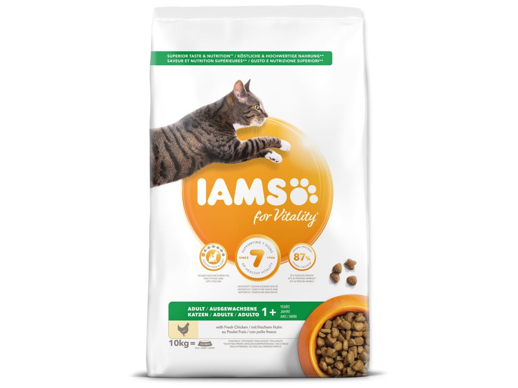 IAMS for Vitality dla dorosłych kotów to w 100% kompletna i zbilansowana, profesjonalnie opracowana karma, którą Twój pupil pokocha i z której skorzysta. Nasza nowa, ulepszona formuła dla dorosłych kotów ze świeżym kurczakiem oparta jest na wysokiej jakości białkach zwierzęcych, starannie dobranych tak, aby wspomagać siedem oznak zdrowej witalności u kotów. Aby koty były zdrowe, aktywne i pełne energii, nasze pyszne receptury zawierają do 87% białka zwierzęcego (całkowitej zawartości białka).