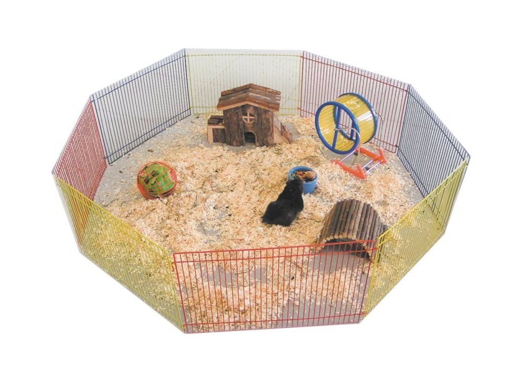 Metalowy kojec dla małych gryzoni. 8x metalowych kolorowych płotków (34 x 23 cm). Całkowity rozmiar ø 91cm. Kojec nie posiada wyposażenia.Parametry dodatkowe