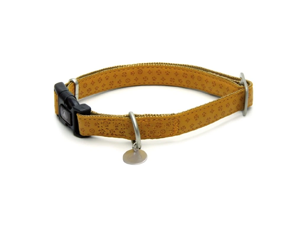Elegancka i trwała obroża wykonana z miękkiej imitacji skóry z tłoczonymi zdobieniami.