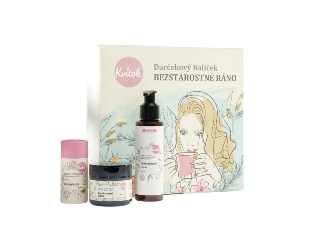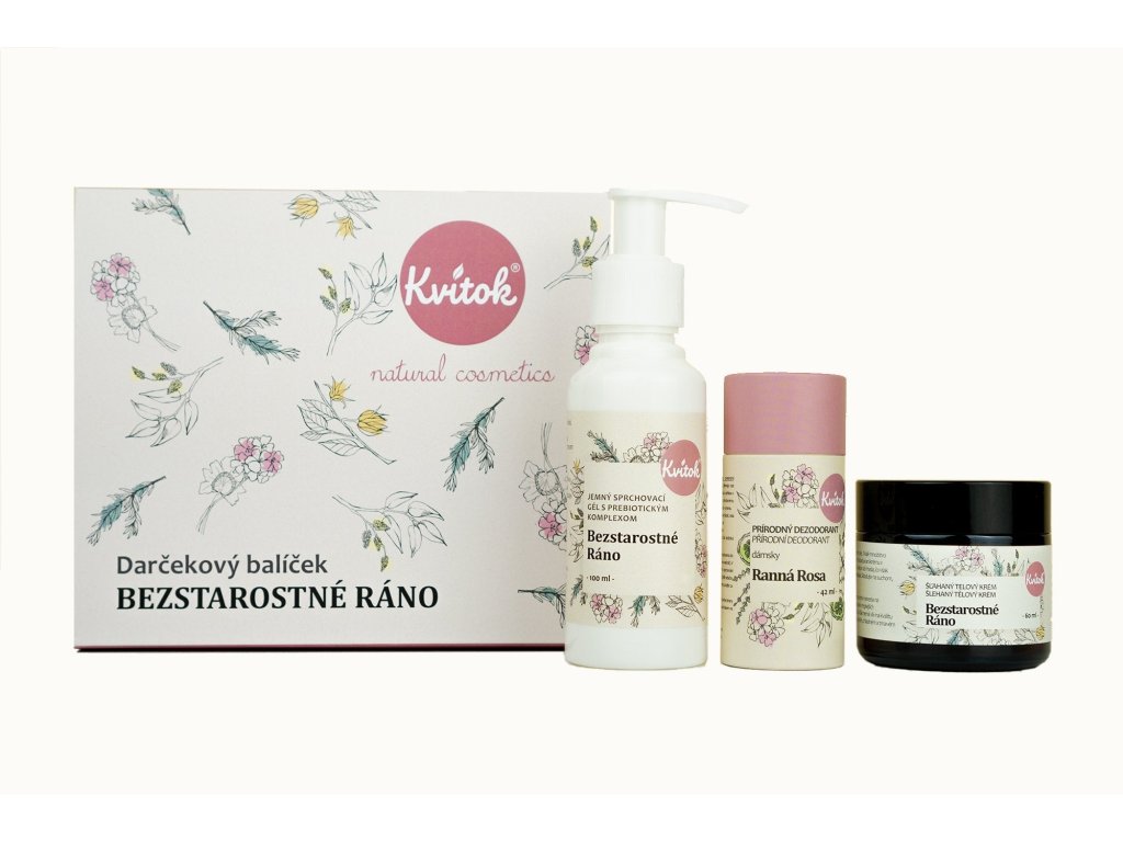 | Obsah balení: | Kvitok Jemný sprchový gel s prebiotickým komplexem Bezstarostné ráno (100 ml), Kvitok Šlehaný tělový krém Bezstarostné ráno (60 ml), Kvitok Tuhý deodorant Ranní rosa (42 ml) |