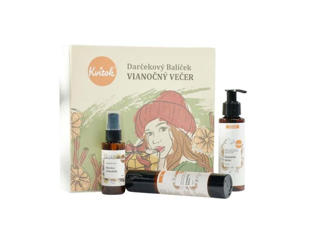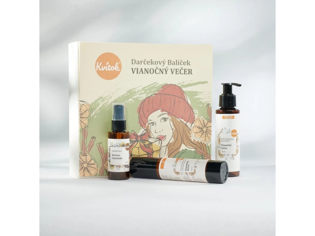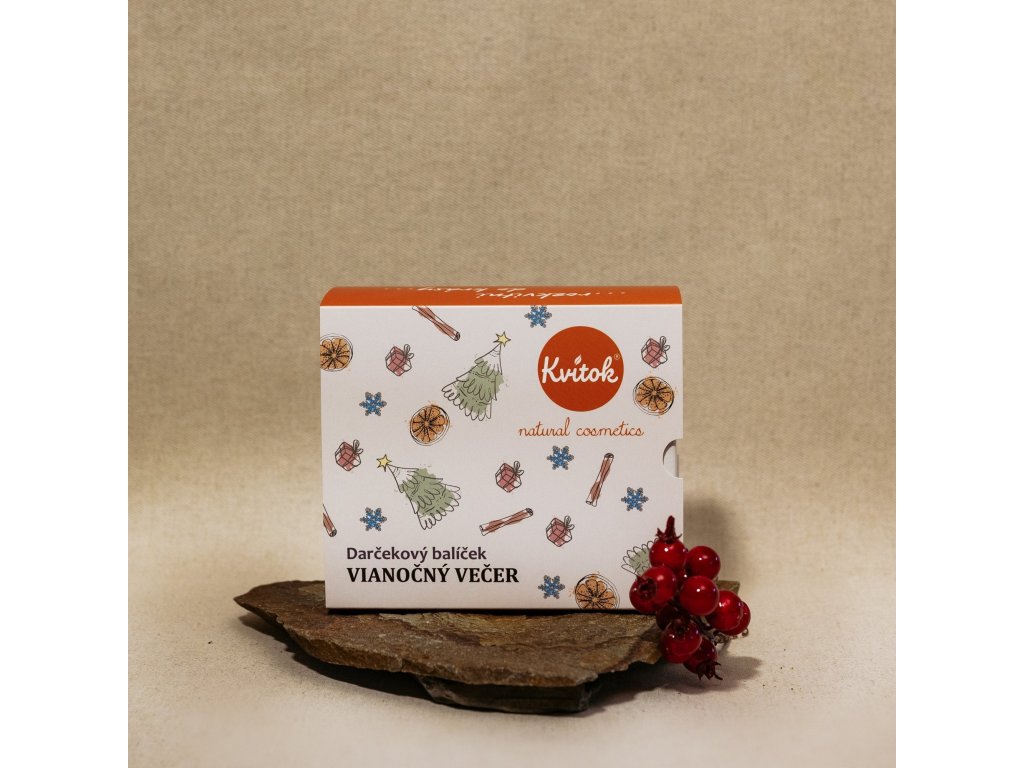 | Obsah balení: | Kvitok Šlehaný tělový krém Vánoční večer (60 ml), Kvitok Tuhý tělový balzám Vánoční večer (40 g), Kvitok Směs esenciálních olejů Vánoční večer (10 ml) |