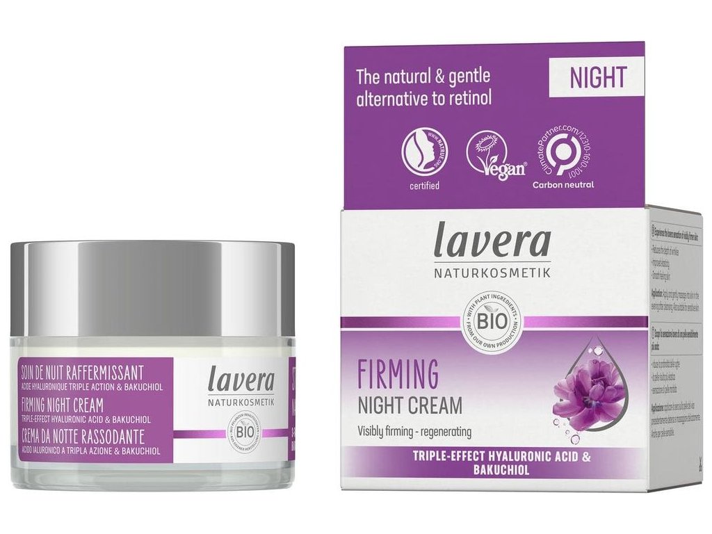Ujędrniający krem na noc 50 ml Wysoce skuteczna naturalna formuła z kwasem hialuronowym stymuluje produkcję kolagenu w skórze i jest odpowiednia również dla skóry wrażliwej. Krem na noc dostarcza skórze niezbędnego odżywienia i nawilżenia w najgłębszych warstwach skóry dzięki zawartości kwasu hialuronowego o niskiej masie cząsteczkowej. Zadbaj o swoją skórę także w nocy, gdy skóra naturalnie się regeneruje. Dzięki kremowi ujędrniającemu na noc Lavera Twoja skóra będzie wypoczęta i pełna dobroczynnych substancji o poranku.