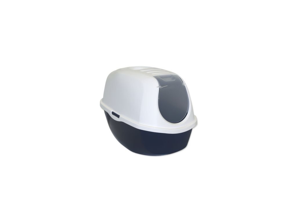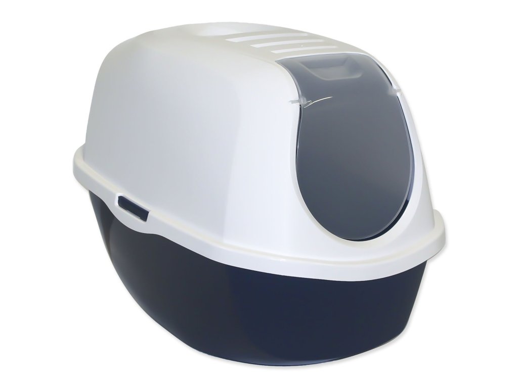 Kuweta dla kota z plastikową pokrywą, drzwiczkami i filtrem w kolorze niebieskim.