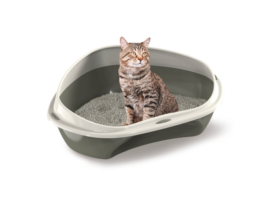 Narożna toaleta dla kotów wykonana z wysokiej jakości, trwałego tworzywa sztucznego. Podniesiona tylna część ułatwia przechowywanie ściółki w środku.