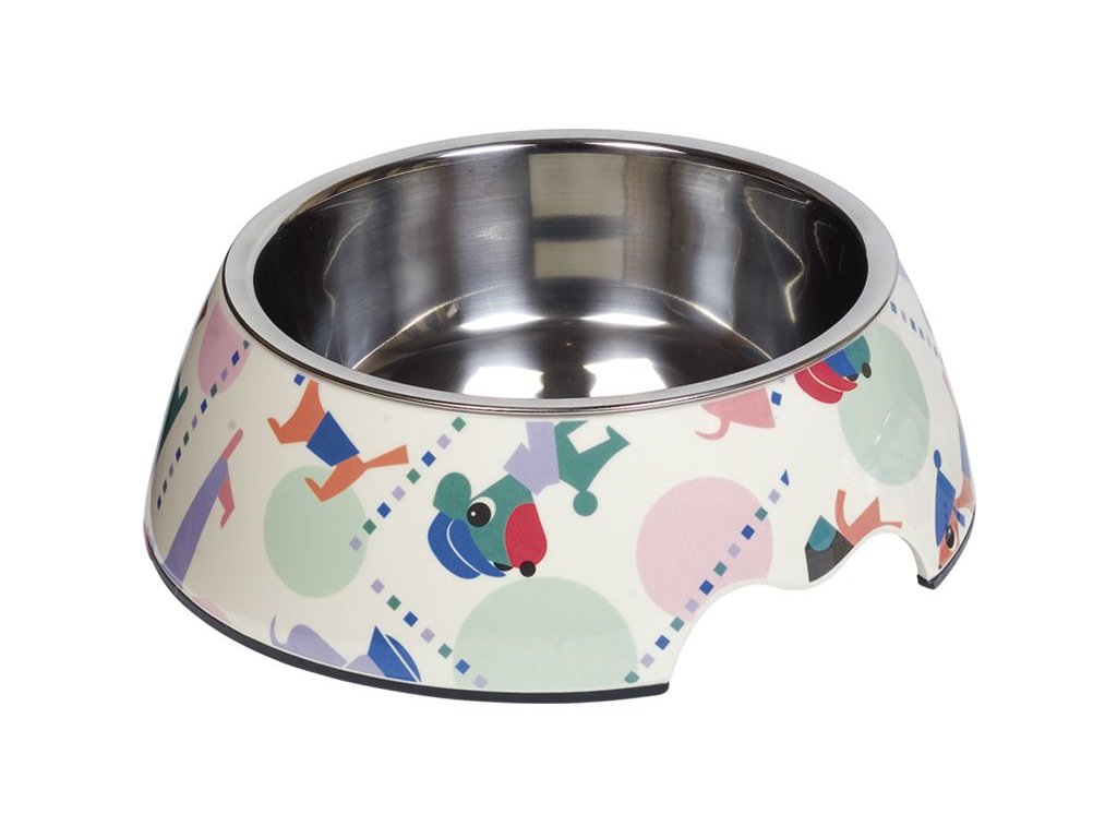 Nowoczesny design miski ze stali nierdzewnej w opakowaniu z melaminy z wizerunkiem psa. Polerowana miska ze stali nierdzewnej umieszczona jest w błyszczącej, trwałej obudowie z melaminy. Stalową miskę można łatwo wyjąć, co ułatwia czyszczenie. Obudowa wykonana jest z najwyższej jakości melaminy, która jest stosowana do produkcji nowoczesnych tworzyw sztucznych. Obudowa z melaminy jest mocna, wytrzymała i co najważniejsze, odporna na uderzenia i zarysowania. Obudowa z melaminy posiada otwór umożliwiający łatwe wyjmowanie z podłoża. Gumowy pierścień na spodzie zapobiega przesuwaniu się miski po podłodze. Miska nie jest przeznaczona do bezpośredniego podgrzewania na kuchence, w kuchence mikrofalowej lub na bezpośrednim ogniu. Nadaje się również do zmywarek. Pojemność: 700 ml Wymiary: ø 22 x 7,5 cm Jaką dużą miskę powinieneś wybrać dla swojego psa? Mały pies o wadze poniżej 10 kg potrzebuje miski o pojemności 0,3–0,5 l. Średniej wielkości pies potrzebuje miski o pojemności od 0,6 do 1 l, natomiast duży pies potrzebuje miski o pojemności od 1 l wzwyż. Dla ras olbrzymich wybieramy miski o pojemności ponad 2 litrów.Parametry dodatkowe