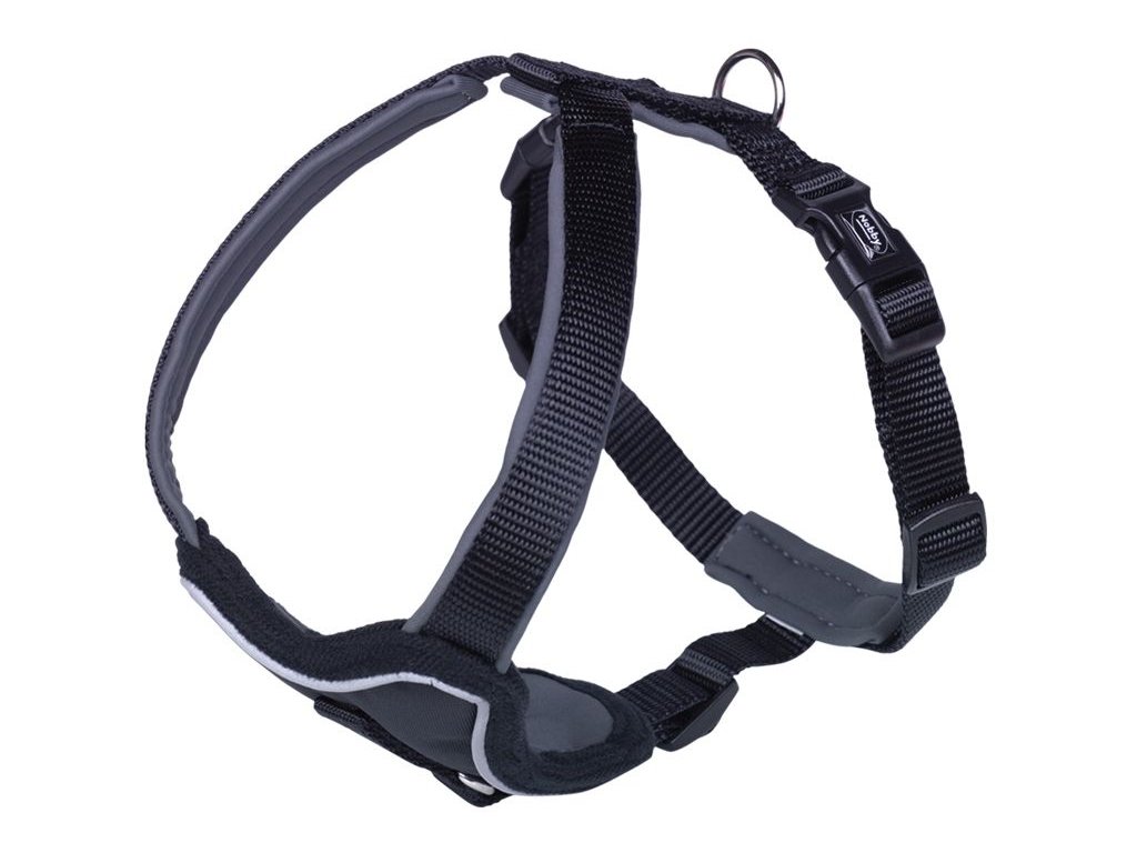Szelki piersiowe Nobby to doskonały kompromis pomiędzy sportowym i funkcjonalnym wyposażeniem, przeznaczonym do aktywnych spacerów i uprawiania sportu z psem. Konstrukcja uprzęży zapewnia prawidłowe i równomierne rozłożenie nacisku podczas ciągnięcia. Uprząż składa się z dwóch części - klatki piersiowej i pleców. Zapewniają równomierne rozłożenie nacisku, nawet gdy pies ciągnie intensywniej. Cała uprząż wykonana jest z bardzo lekkich, funkcjonalnych materiałów, które są łatwe w utrzymaniu. Po prawidłowym dopasowaniu uprząż stabilnie przylega do ciała i nie skręca się. Tego typu szelki są szczególnie polecane dla psów o szerokiej klatce piersiowej (np. mops, buldog francuski, buldog, stafford itp.). Szelki wykonane są z mocnego nylonu, który w newralgicznych miejscach został podszyty neoprenem. Neopren jest delikatny dla sierści i szybko schnie. Nie zapomniano również o bezpieczeństwie, dlatego szelki wyposażono w elementy odblaskowe na klatce piersiowej. Szelki są bardzo elastyczne dzięki możliwości regulacji rozmiaru zarówno między przednimi łapami, jak i w obwodzie klatki piersiowej. Zanim jednak wybierzesz rozmiar, dokładnie zmierz swojego psa! Rozmiar: SM Szerokość paska: 25 mm Regulowany rozmiar paska piersiowego (za przednimi łapami): 35-45 cm Jak wybrać odpowiedni rozmiar szelek? Aby wybrać odpowiedni rozmiar szelek, zmierz obwód klatki piersiowej psa za przednimi nogami (zawsze mierz miękką miarką krawiecką). Podane wymiary uprzęży (np. 60-75 cm) wskazują na możliwość regulacji obwodu pasa piersiowego uprzęży. Jeśli więc obwód klatki piersiowej Twojego psa wynosi np. 55 cm, wybierz rozmiar 50-60 cm. Wybierz rozmiar uprzęży z minimalnym marginesem obwodu klatki piersiowej.Parametry dodatkowe