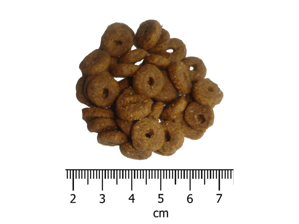 Składniki analityczne: białko surowe 31,5%, oleje i tłuszcze surowe 16,5%, kwasy tłuszczowe omega 6: 3%, kwasy tłuszczowe omega 3: 0,9%, włókno surowe 2,3%, całkowity błonnik pokarmowy 6,5%, popiół surowy 6,9%, wapń 1,3%, fosfor 1,1%, wilgotność 9%.