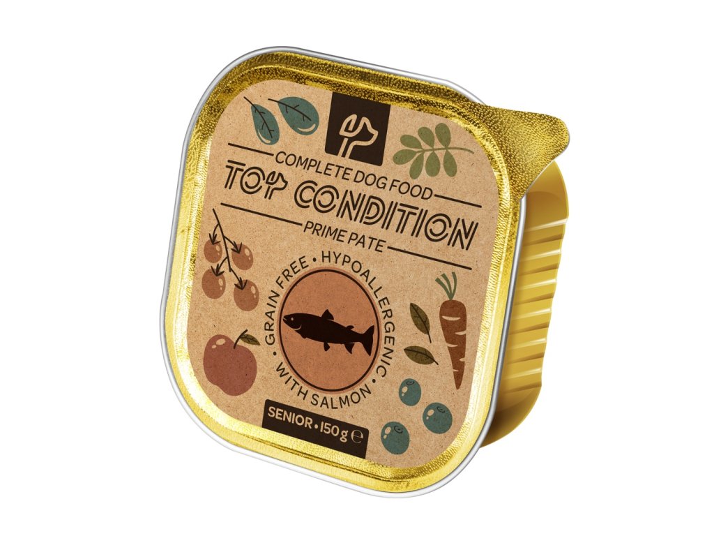 Pasztet mięsny odpowiedni dla starszych psów, pełen zdrowych składników. Pasztet z łososia Top Condition Dog Senior zawiera inulinę, która wspomaga trawienie i wzmacnia układ odpornościowy psa.