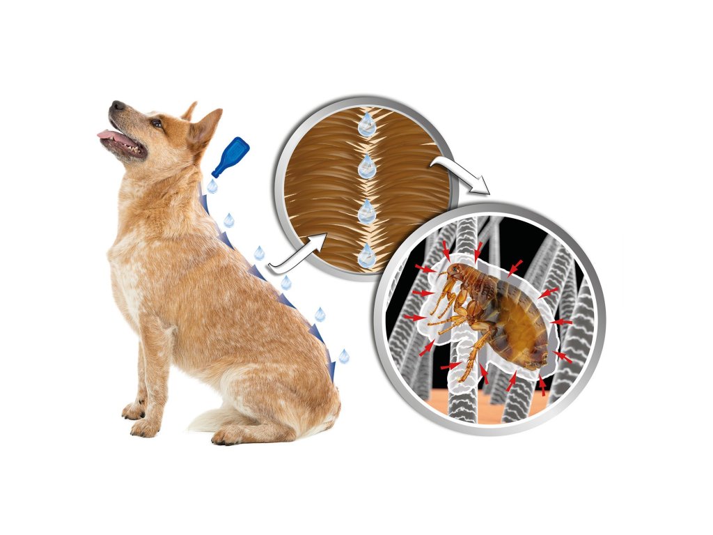 Sposób użycia: Zawartość jednej pipety nanieść bezpośrednio na skórę psa wzdłuż kręgosłupa od szyi do ogona. Stosować co cztery tygodnie lub po kąpieli.