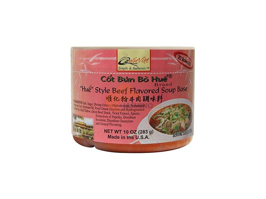 Przyprawy do przygotowania bulionu do Bun Bo Hue (popularnej zupy z makaronem ryżowym w środkowym Wietnamie - Hue). Produkt nie zawiera MSE i konserwantów. Produkt zawiera przyprawy na 20 porcji i jest pakowany w pojedynczą torebkę. Składniki: Sól, cukier, ekstrakt z krewetek, olej sojowy, suszona cebula, bulion wołowy, ekstrakt drożdżowy, inozynian disodowy, guanylan disodowy, aromat. Alergeny: soja, pszenica, krewetki. Potrzebne składniki: 3 kawałki ścięgien wołowych, 2 funty bezkostnej nogi wieprzowej, 2 funty golonki wołowej.#Str10 Sposób przygotowania: Mięso blanszować przez 15 minut. Wylej roztwór i opłucz mięso. Mięso włożyć do garnka, zalać wodą tak, aby była przykryta, i zagotować. Rozpuść zawartość pojemnika na bazę do zupy marki Cot. Wieprzowinę wyjąć po 1 godzinie gotowania, a wołowinę po 2 godzinach. Doprowadź wodę do objętości 2 galonów (6,7 l) lub do smaku. Doprowadzić do wrzenia i podawać. Do misek. Przechowywanie: Przechowywać w suchym i chłodnym miejscu. Kraj pochodzenia: USA.Parametry dodatkowe