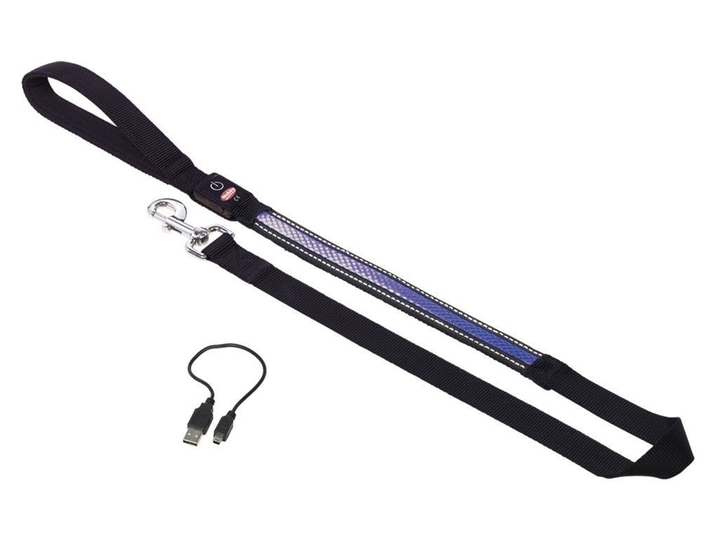 100% niewidoczna, podświetlana smycz z diodami LED i doskonale widocznymi paskami odblaskowymi. Długość 120 cm Szerokość 25 mm Odporna na deszcz. Niebieska świecąca smycz to praktyczny gadżet na wieczorne spacery z czworonożnym przyjacielem lub w porach roku, w których brakuje światła. Twój pies będzie widoczny dla Ciebie i innych uczestników ruchu drogowego z odległości do 500 m przez 2 godziny. Gdy oświetlenie LED się rozładuje, możesz je naładować za pomocą dołączonego do zestawu kabla USB. Możesz ustawić światło na trzy różne tryby: jeśli naciśniesz przycisk ON/OFF raz, światło będzie migać w krótkich odstępach czasu i będzie wyraźnie widoczne o zmierzchu lub w deszczową pogodę. Ponowne naciśnięcie przycisku spowoduje wydłużenie odstępów między miganiem. Po wybraniu trzeciego trybu czerwone światło będzie świecić ciągle, dzięki czemu Twój pies będzie lepiej widoczny dla innych użytkowników drogi. Nigdy nie stracisz swojego psa z oczu podczas wspólnego spaceru!Parametry dodatkowe