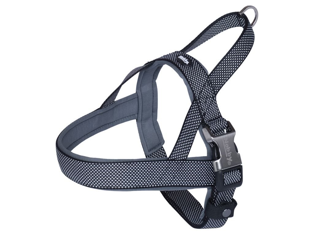Nowoczesne norweskie szelki Nobby dla psów wykonane z nylonu i neoprenu. Charakteryzuje się wygodą i łatwością noszenia. Nadaje się zarówno na codzienne spacery, jak i na treningi różnych dyscyplin sportowych (agility, flyball - tutaj wygodna pętla z tyłu szczególnie przydaje się do łatwego prowadzenia psa). Nylonowa warstwa wierzchnia nadaje elegancki wygląd. Klamra zapinająca wykonana jest z polerowanego metalu i tworzywa sztucznego. Eleganckie i funkcjonalne zarazem. Rozmiar: długość klatki piersiowej 54 cm szerokość paska 40/45 mm płynna regulacja obwodu klatki piersiowej 68-85 cm kolor czarny Podszewka z neoprenu jest delikatna dla sierści psa, ale jednocześnie szybko wysycha, co sprawia, że pies lubi się kąpać latem. Wygodne wyściółki neoprenowe w okolicy klatki piersiowej, szyi i ramion. Optymalny komfort noszenia oraz gwarancja, że szelki nie będą ocierać ani wyrywać sierści psa podczas biegu. Łatwa i szybka instalacja uprzęży. Szybkie mocowanie smyczy za pomocą górnej pętli. Szelki norweskie zostały opracowane specjalnie dla aktywnych psów i ich właścicieli, dzięki czemu idealnie nadają się do jazdy na rowerze lub biegania. Szelki zapewniają psu wygodę noszenia, nawet jeśli lekko ciągnie. Wszyta w obroży rączka pozwala właścicielowi psa na szybką reakcję w nagłych wypadkach i, jeśli zajdzie taka potrzeba, umożliwienie psu samodzielnego chodzenia. Szelki Nobby to gwarancja wysokiej jakości i funkcjonalności w połączeniu z atrakcyjnym wzornictwem.Parametry dodatkowe
