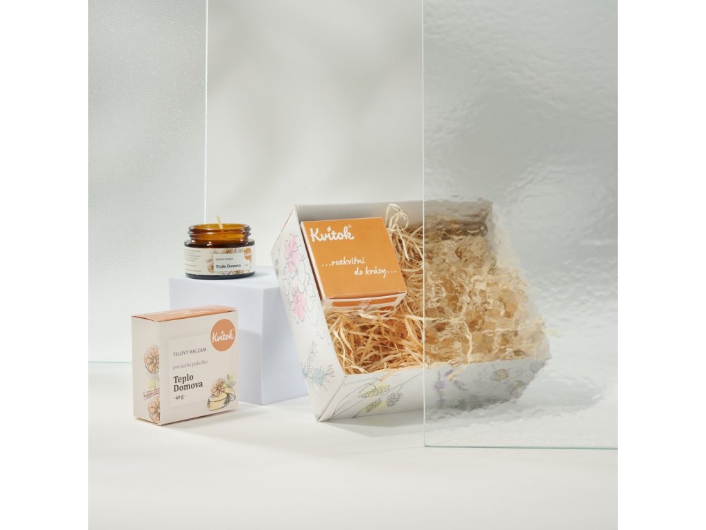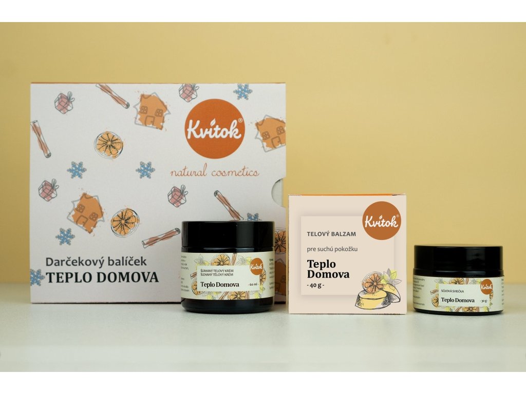 | Obsah balení: | Kvitok Šlehaný tělový krém Teplo domova (60 ml), Kvitok Tuhý tělový balzám Teplo domova (40 g), Kvitok Sójová svíčka Teplo domova (30 ml) |