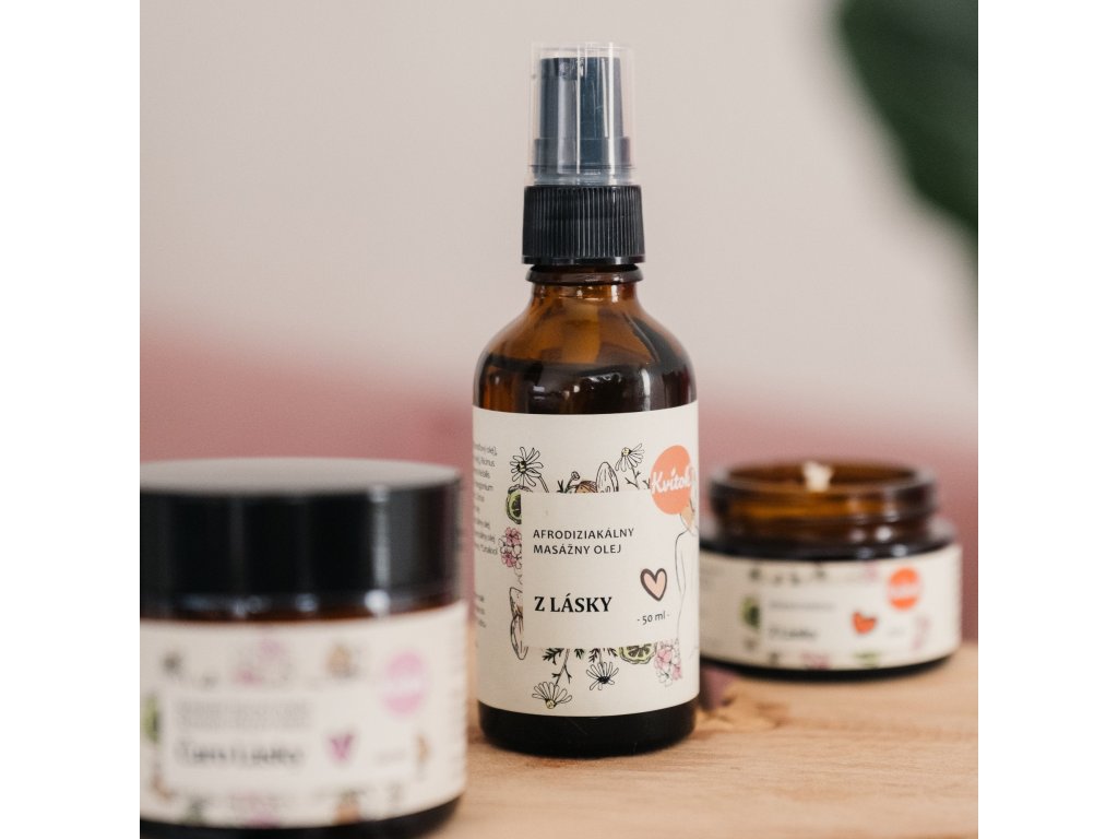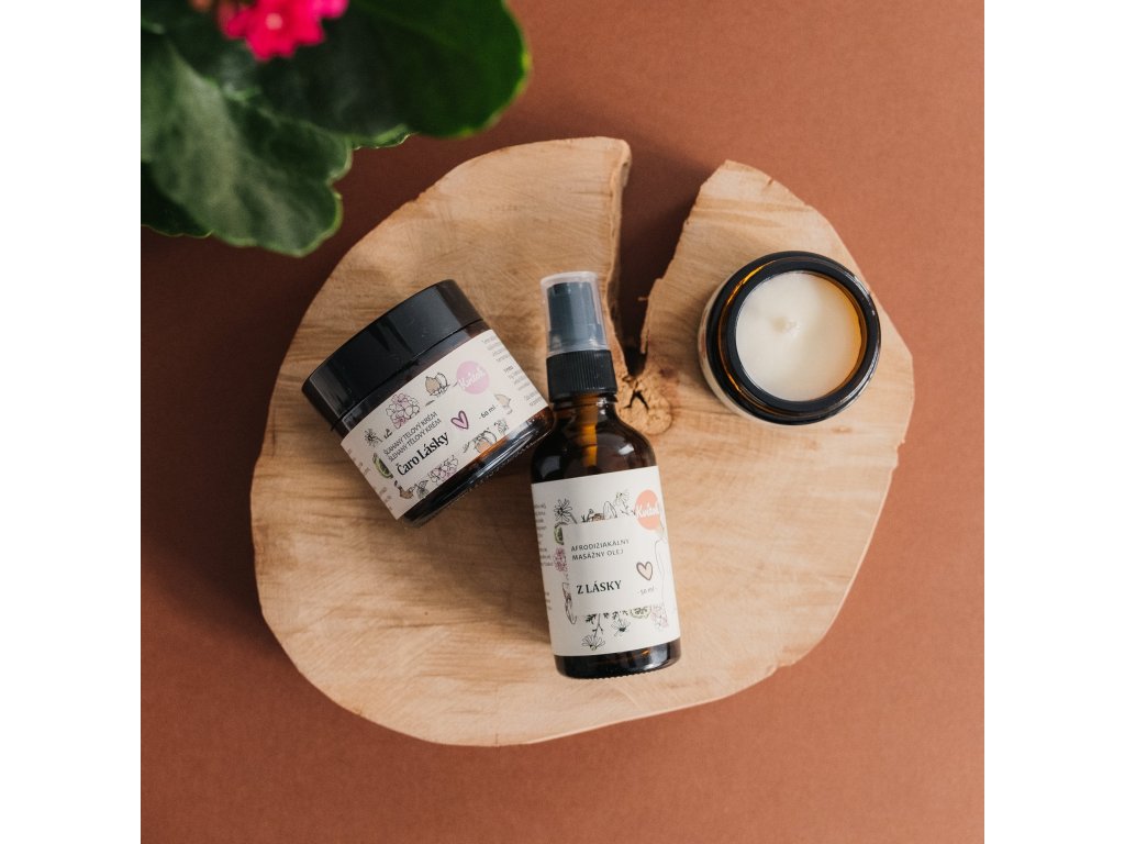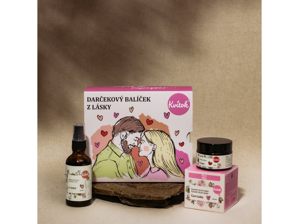 | Obsah balení: | Kvitok Afrodiziakální masážní olej Z lásky (50 ml), Kvitok Šlehaný tělový krém Kouzlo lásky (60 ml), Kvitok Sójová svíčka Z lásky (30 ml) |