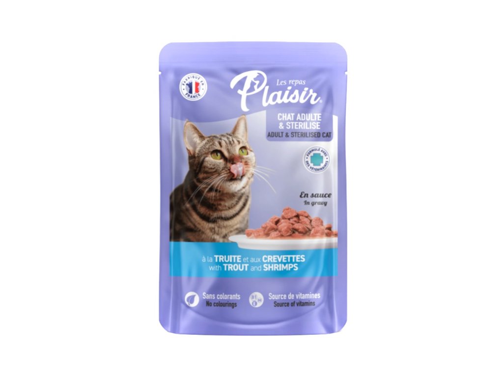 Kompletní mokré krmivo pro dospělé kočky. Šťavnatá masová kapsička s pstruhem a krevetami.