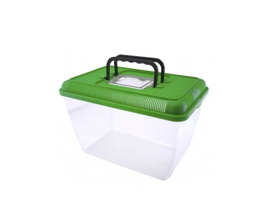 Lehký přenosný box pro terarijní zvířata, s větracími otvory ve vrchní části.