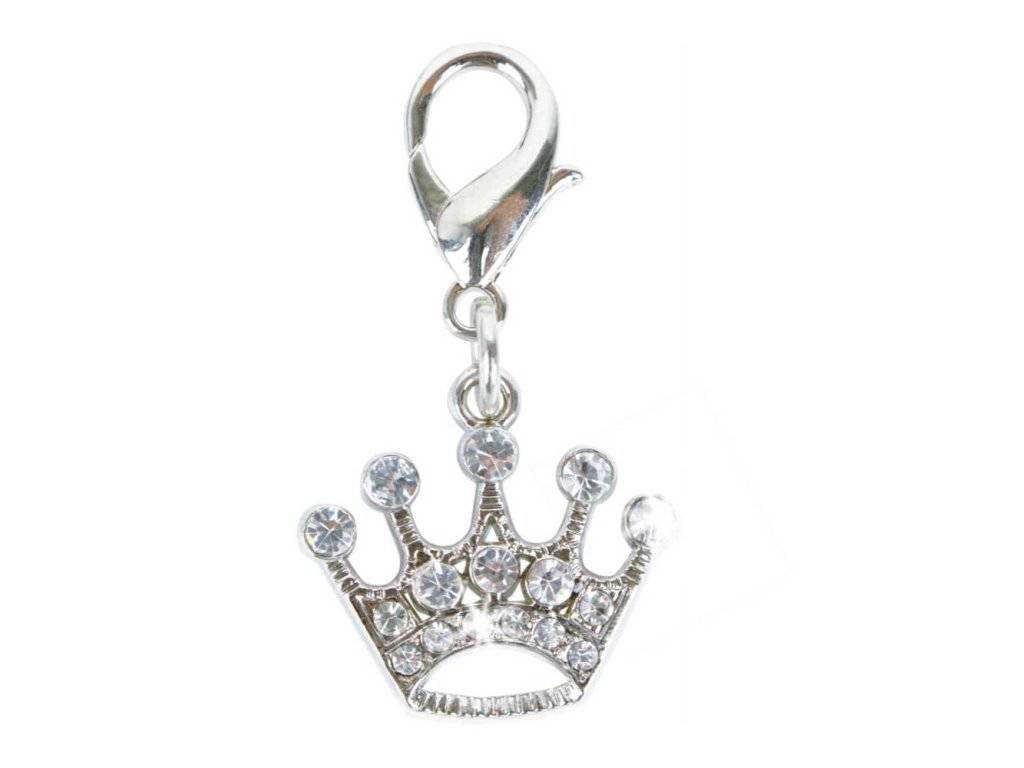 Přívěšek na obojek ve tvaru korunky vykládaný kamínky.