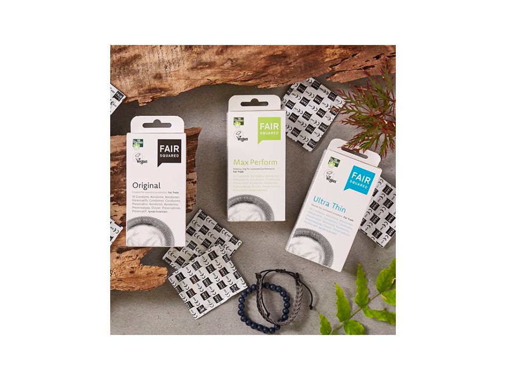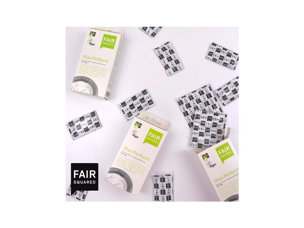 Prezervativele Fair Squared sunt o barieră de protecție confortabilă și eficientă împotriva sarcinilor nedorite și a bolilor cu transmitere sexuală. Sunt realizate din material transparent extra subțire, a cărui preparare a fost realizată folosind latex natural cultivat în India, în conformitate cu principiile comerțului echitabil. Prezervativele sunt nearome și parfumate, cu un lubrifiant fără ingrediente spermicide. Fiecare prezervativ Max Perform este echipat cu un inel pentru penis pentru o potrivire mai strânsă, care previne alunecarea accidentală a prezervativelor și acționează, de asemenea, ca un suport pentru erecție. Spre deosebire de prezervativele convenționale, acestea nu conțin cazeină din proteina din lapte și, prin urmare, sunt potrivite pentru vegani.Parametri suplimentari