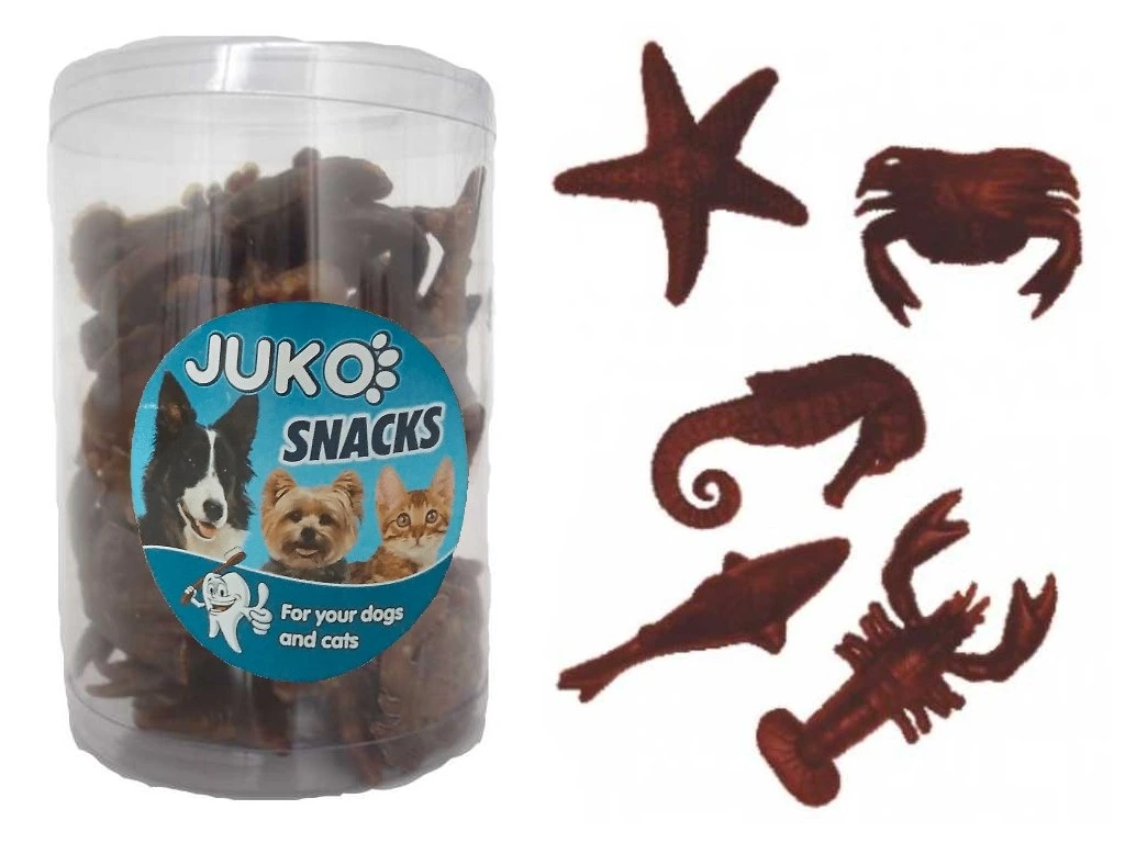 O tratare delicioasă pentru câini în formă de fructe de mare, cu aromă de crab.