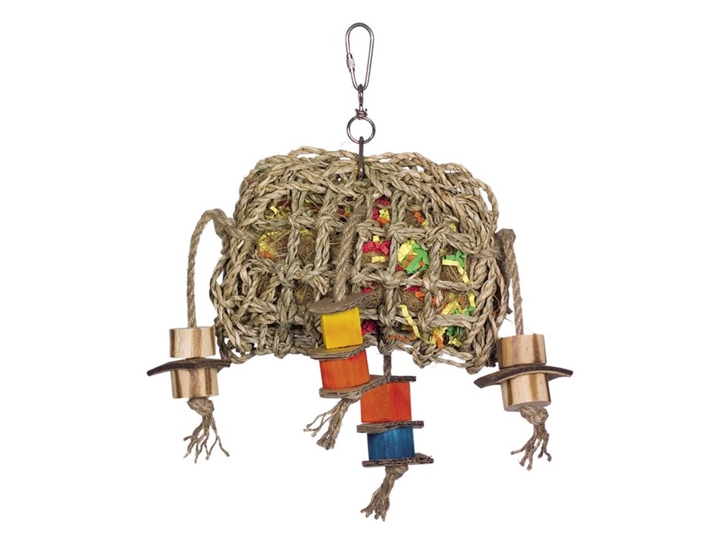 Păsările sunt creaturi curioase în mod natural și puteți dezvolta cu ușurință această trăsătură naturală cu ajutorul accesoriilor potrivite pentru cuști. Jucăria activă de la Nobby constă dintr-o rețea de bază țesută din alge marine, în care poate fi ascunsă mâncarea. Grila țesută este umplută cu hârtie și fibre de nucă de cocos și sisal. Există și alte accesorii din lemn, hârtie, piele și nucă de cocos atârnate de el. Instalare ușoară în cușcă folosind o carabină metalică. Dimensiune totala: 29 x 21 cm. Cu bucăți de nucă de cocos.Parametri suplimentari