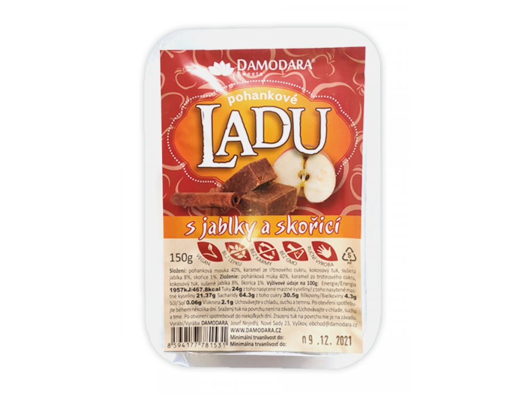 Ingrediente: făină de hrișcă 40%, caramel de trestie de zahăr, grăsime de cocos, mere uscate 8%, scorțișoară 1% Depozitare: A se păstra la loc răcoros, uscat și întunecat. Valori nutriționale la 100 g: Energie 1957kJ/467.8kcal, proteine 4.3g, grăsimi 24g, carbohidrați 64.3g, sare 0.06g, fibre 2.1g. Greutate: 150g Producator: DAMODARA - Josef Nejedlý, Březina 23, 683 08 Nové SadyParametri suplimentari