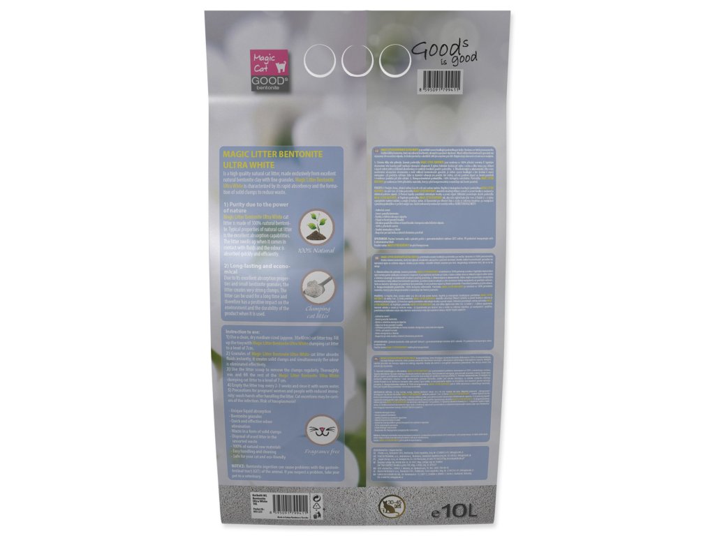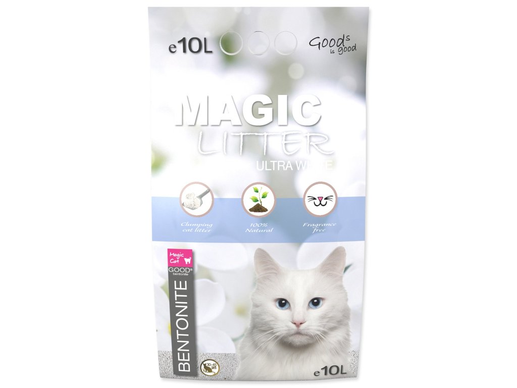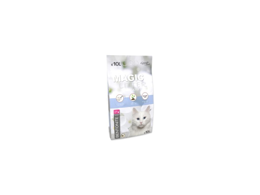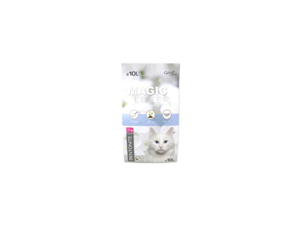 Magic Litter Bentonite ultra white este olinie super premium de așternuturi pentru pisici, care conține argilă cu granulație fină cu proprietăți excelente de absorbție.