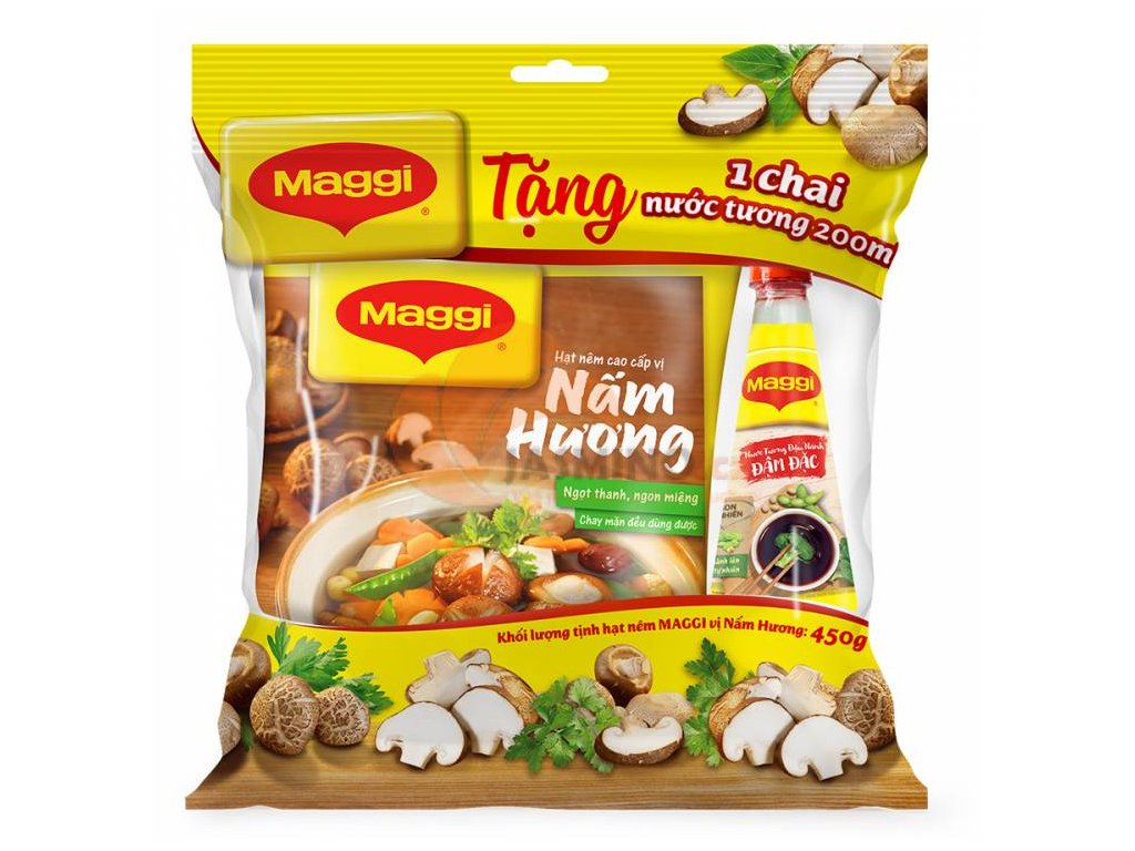 Ingrediente: sare, potențiatori de aromă (E621, E35, E627), zahăr, amidon de tapioca, pudră de soia, zahăr, pudră de ciuperci, ulei vegetal (soia, arahide, nucă de cocos), aromă de ciuperci și legume (soia, gluten și țelină), condimente (praf de piper), praf de ciupercă. Alergii: gluten și soia. Valori nutritive la 100g: Energie 837,4kJ/200kcal / Grasimi 0,61g saturate 0,3g / Carbohidrati 33,3g zahar 16g / Proteine 14,8g / Sare 20g. Depozitare: A se pastra intr-un loc uscat si racoros. Țara de origine: Vietnam.Parametri suplimentari