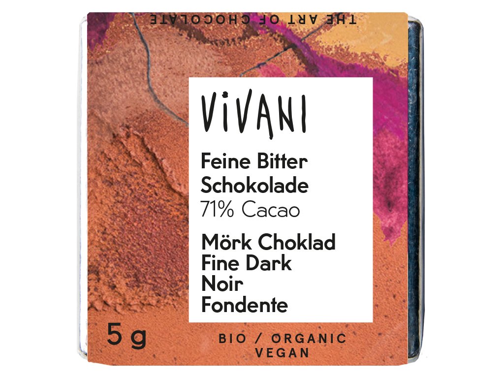 Cutie de hârtie cu 200 de bucățele mici de ciocolată neagră (5 g fiecare, 1 kg în total) cu un frumos design Vivani. Ciocolata conține 71% cacao, este îndulcită cu zahăr natural din trestie și nu conține lecitină din soia sau alți emulgatori. Ciocolatele mici sunt ideale pentru magazinele de produse alimentare bio ca articol la casă, un mic cadou pentru clienții obișnuiți sau un cadou gratuit cu cafea. Restul dintre noi se pot răsfăța cu ele ca o mică recompensă, în pachete cadou sau pentru oaspeți cu cafea.