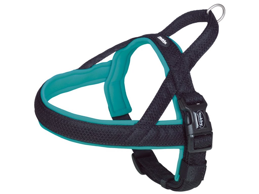 Ham norvegian pentru câini din nailon și neopren. Se caracterizează prin faptul că este confortabil și ușor de purtat. Este potrivit atât pentru plimbările de zi cu zi, cât și pentru antrenamentele în diverse sporturi (agilitate, flyball - aici bucla confortabilă de pe spate este deosebit de utilă pentru manipularea ușoară a câinelui). Stratul superior de nailon seamănă cu o plasă în aspect. Elemente din metal argintiu mat (inele + carabina). Dimensiune: lungime piept 62 cm, latime curea 40/45 mm, circumferinta piept reglabila continuu 75-98 cm. Căptușeala din neopren este blândă cu blana câinelui, dar se usucă rapid și atunci când câinelui îi place să facă baie vara. Captuseala confortabila din neopren in zona pieptului, gatului si umerilor. Confort optim la purtare și asigurarea faptului că hamul nu freca și nu smulge blana câinelui în timpul alergării. Instalare ușoară și rapidă a hamului. Atașare rapidă a lesei folosind bucla de sus. Hamul norvegian a fost dezvoltat special pentru câinii activi și proprietarii de câini, făcându-l ideal pentru ciclism sau jogging. Hamul asigură că câinele tău este confortabil de purtat, chiar dacă trage ușor. Mânerul cusut de pe guler permite proprietarului câinelui să reacționeze rapid în caz de urgență și, dacă este necesar, să lase câinele să meargă singur. Hamul Nobby garanteaza calitate si functionalitate inalta combinate cu un design atractiv.Parametri suplimentari